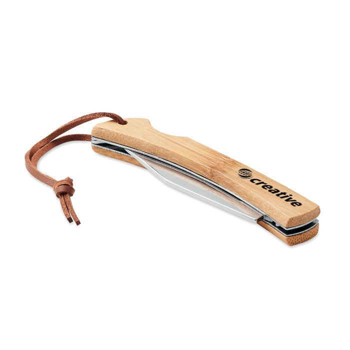 Couteau pliant en acier inoxydable 2CR13 et manche en bambou avec cordon en PU.