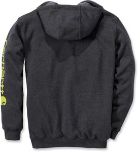 Vous remarquerez la capuche en 2 parties avec son cordon de serrage assorti, la poche chauffe mains kangourou avec l'étiquette Carhatt cousue, les poignets et le tour de taille en côte stretch avec élasthanne et enfin le logo imprimé sur la manche gauche.
