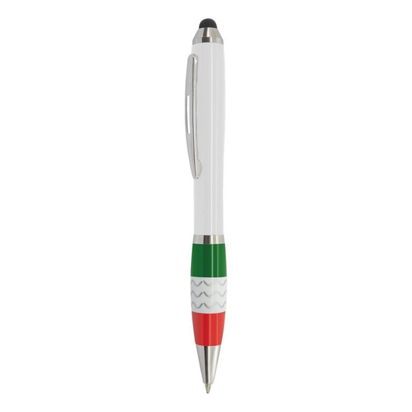Stylo à bille avec mécanisme rotatif, doté d'une prise anti-stress. Embout tactile. Encre bleue.