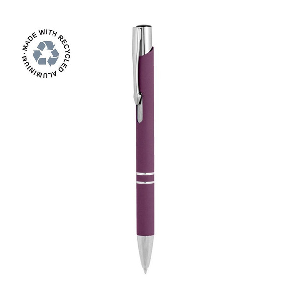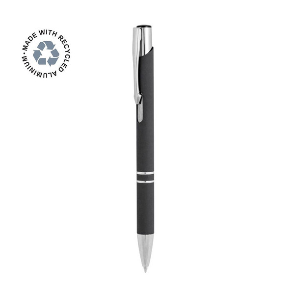 Stylo à bille dont le corps est en aluminium recyclé avec finition en caoutchouc. Mécanisme à poussoir, corps coloré avec finition soft-touch, avec grip annelé de couleur argentée.