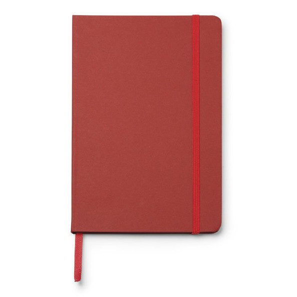 Carnet A5 avec couverture rigide fabriquée à partir de déchets de fruits. Fermeture élastique et signet assortis colorés. 80 feuilles lignées de couleur crème.