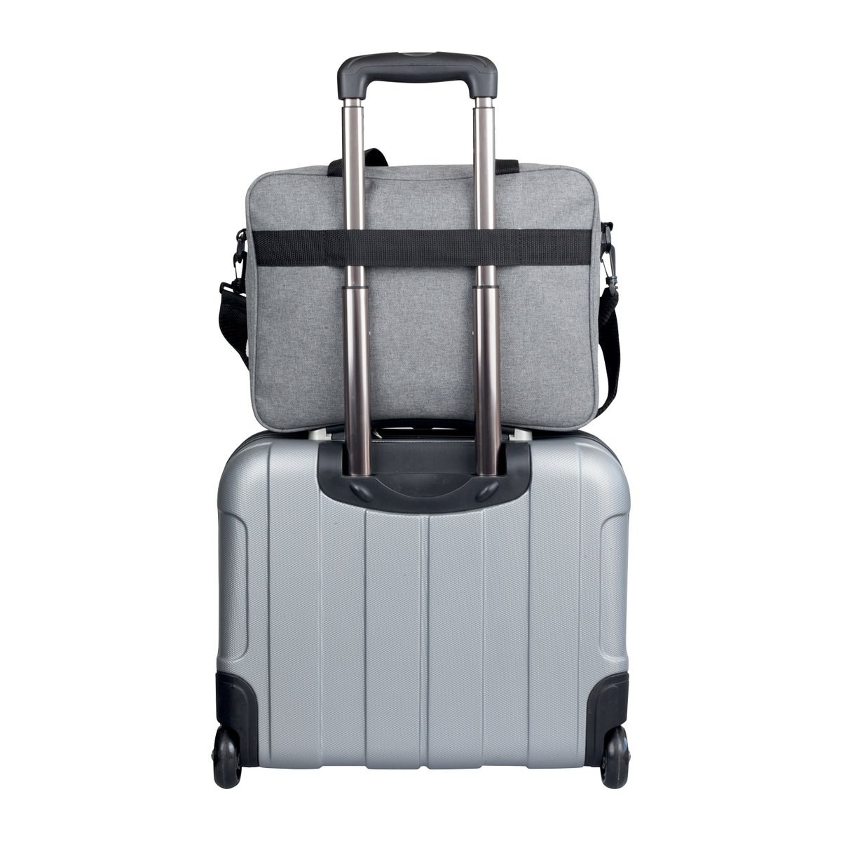 Sac porte-documents en polyester 600D en couleur grise et fermeture éclair. Poche extérieure avec fermeture à scratch, manches renforcées, bandoulière réglable et mousqueton, bande au verso pour l'accrocher au trolley.