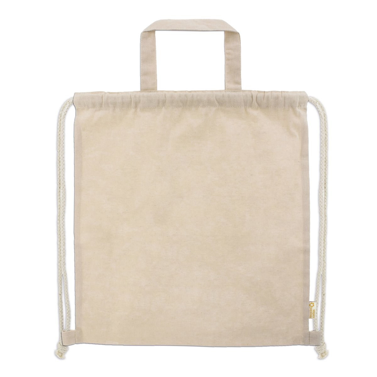Sac Shopping/sac à dos à cordon, en coton recyclé résistant de 150g/m2, avec poignées assorties. Cordes en coton naturel. Disponible dans une large gamme de couleurs.