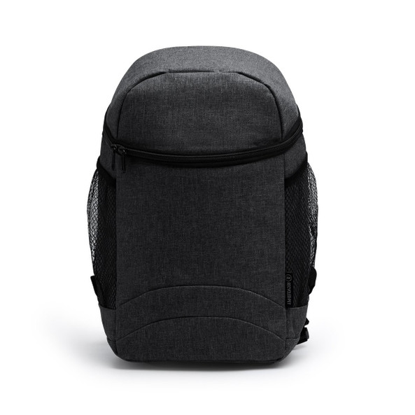 Sac à dos isotherme en polyester recyclé RPET avec finition mélangée. Grand compartiment principal avec fermeture éclair, avec intérieur isotherme. Deux poches latérales en filet. Bretelles réglables.