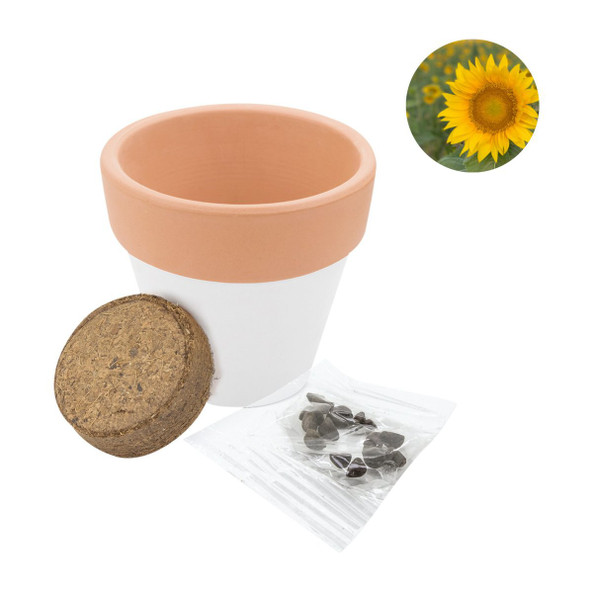 Pot de fleurs en terre cuite bicolore, livré avec un substrat de culture et des graines de tournesol. Présenté dans un emballage individuel en carton.