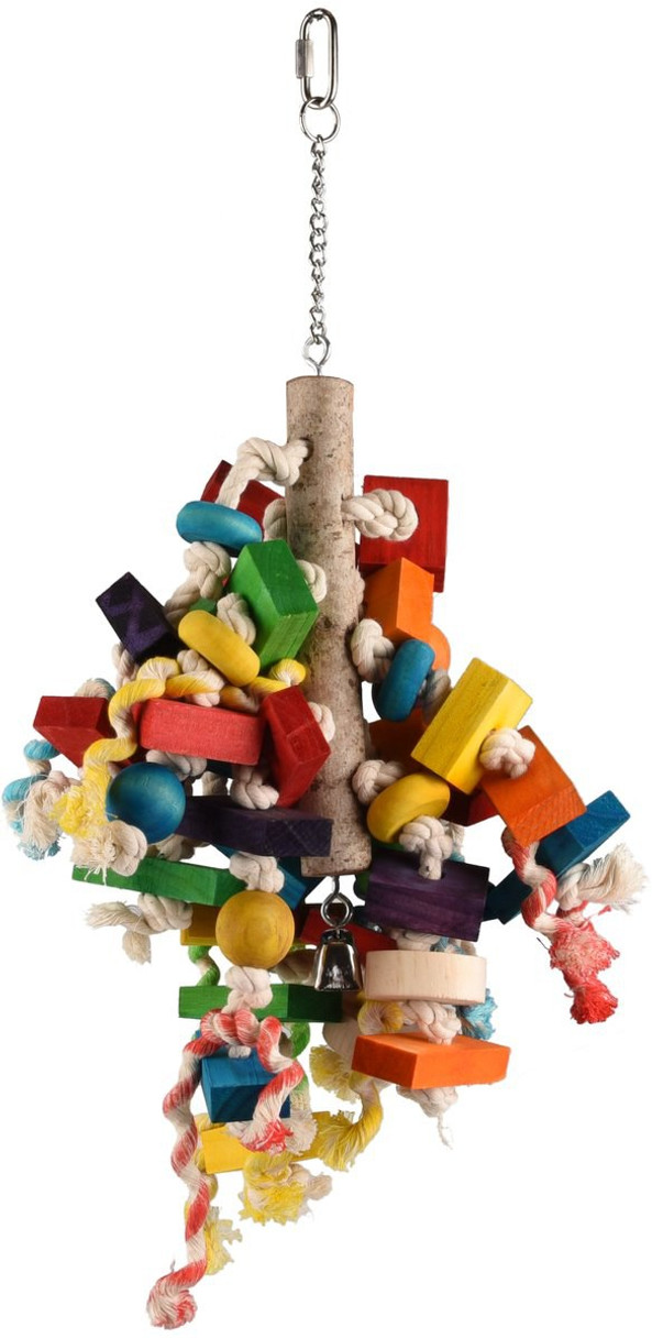 Suspension de cage colore et joyeuse pour les oiseaux. Parfait pour accrocher dans la cage et divertir votre oiseau. Le jouet est fabriqu partir d'un bton en bois, orn de cordes et de perles. Vous pouvez facilement l'accrocher avec le crochet attach la grille de la cage de votre oiseau.