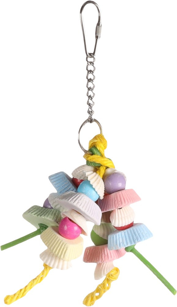 Rends ton perruche heureuse avec le jouet coloré Caly Multicolore ! Il est fabriqué en plâtre, coquillages et cuir et contient des perles, des coquillages, des cordes et des morceaux de plâtre à grignoter. Accroche-le facilement avec le système de suspension en métal.
