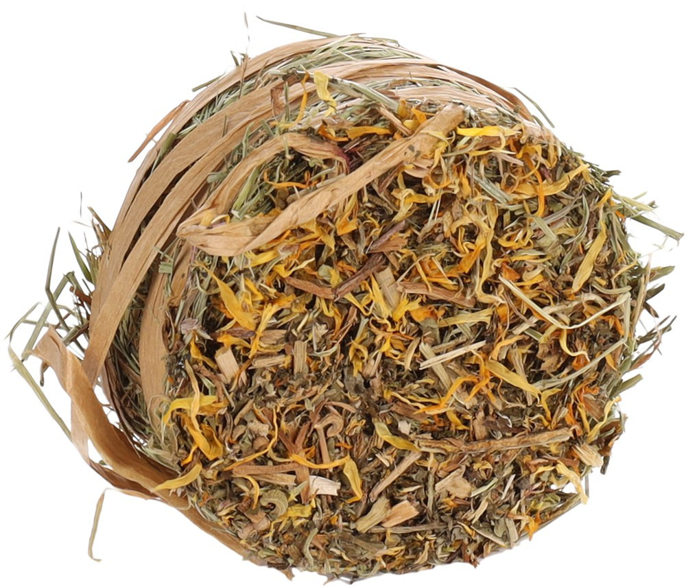 Notre délicieux rouleau de foin avec pissenlit et souci n'est pas seulement délicieux, mais aussi entièrement comestible grâce à la corde en cellulose. Il est sans céréales, sans sucre et sans additifs artificiels. Ton cher quadrupède en profitera pleinement !