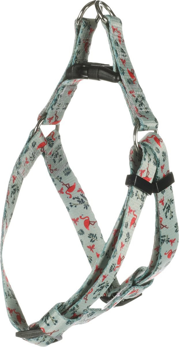 Ce harnais pour chien, appel Samar, est de couleur vert clair avec un joli imprim flamant. Le harnais est fabriqu en polyester et est rglable et se ferme l'aide d'un systme de clics. Ce harnais a 2 anneaux en D o la laisse peut tre facilement attache. Il est disponible en 3 tailles et bien sr, une belle laisse assortie est galement disponible !