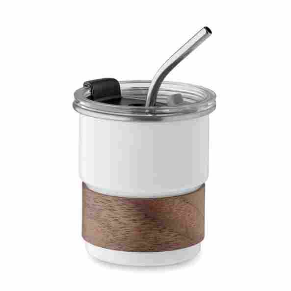 Gobelet simple paroi en acier inoxydable recyclé (90 % d'acier inoxydable recyclé et 10 % d'acier inoxydable) avec manchon amovible en bois d'acacia et paille en acier inoxydable.