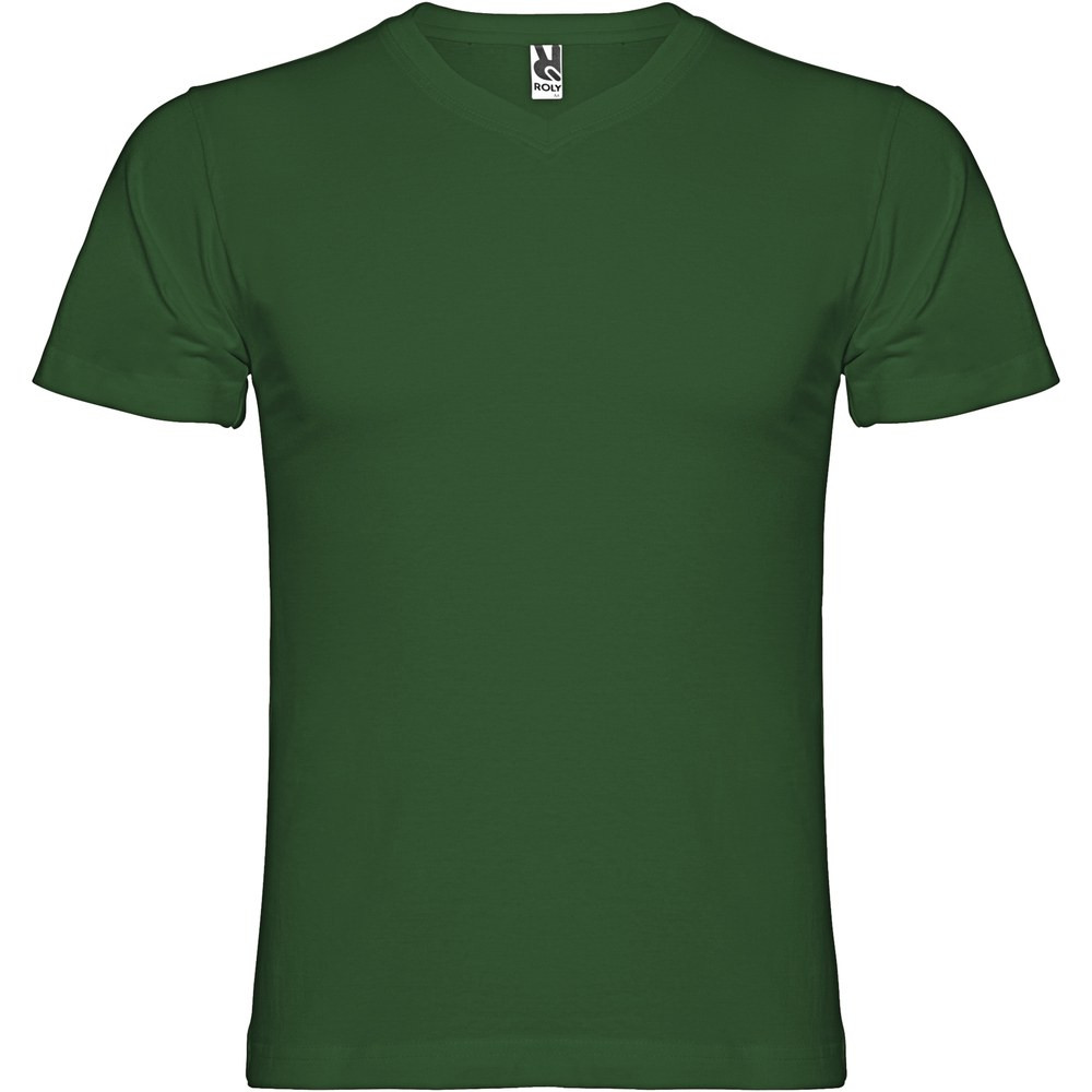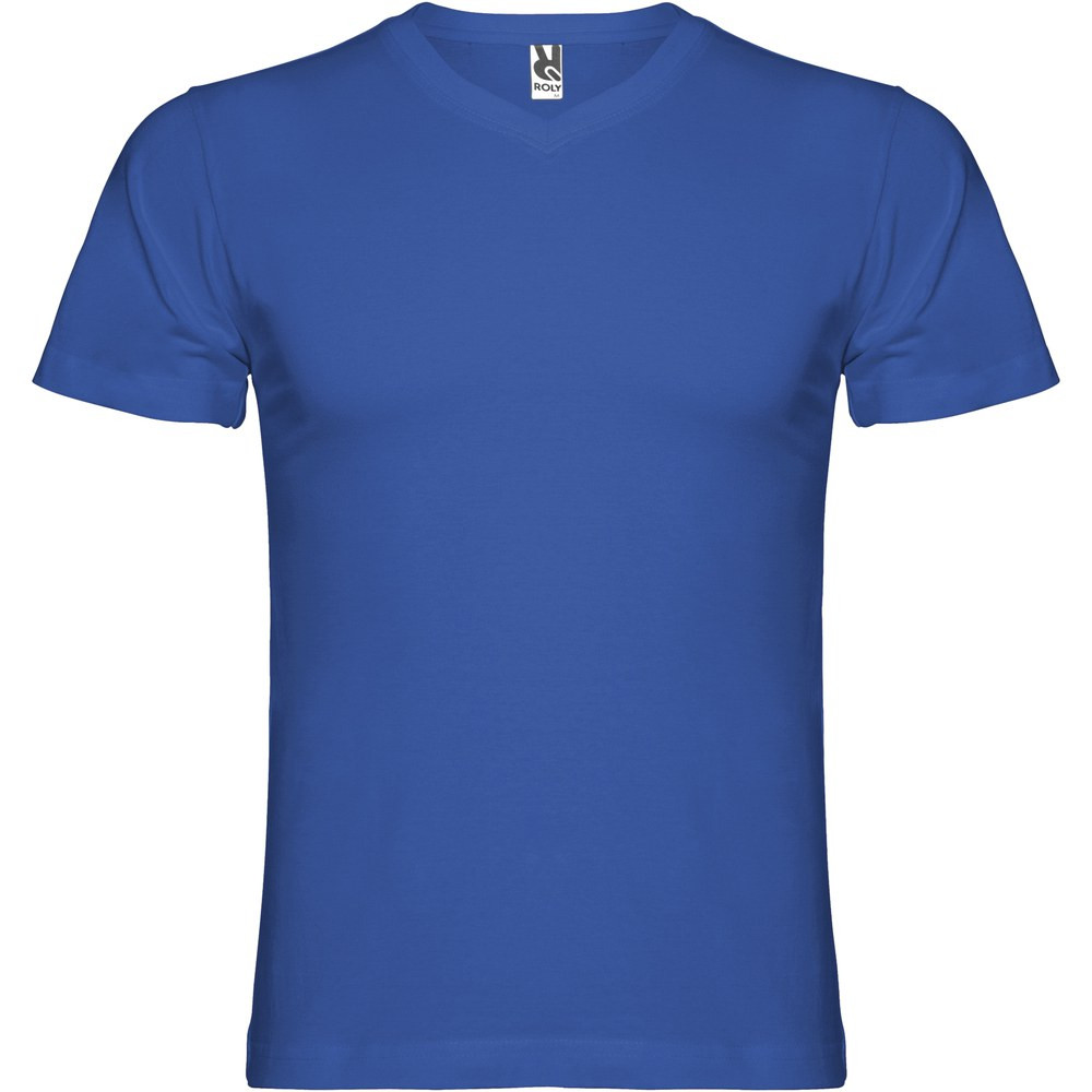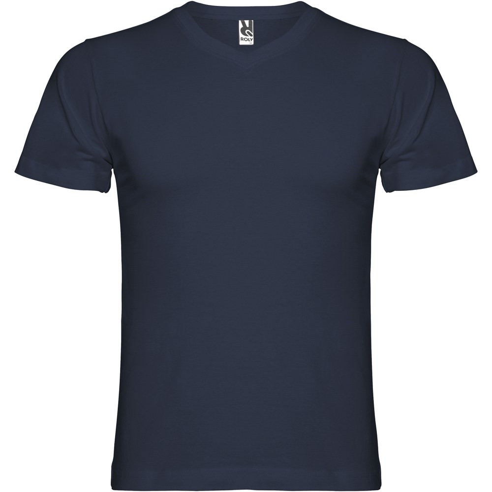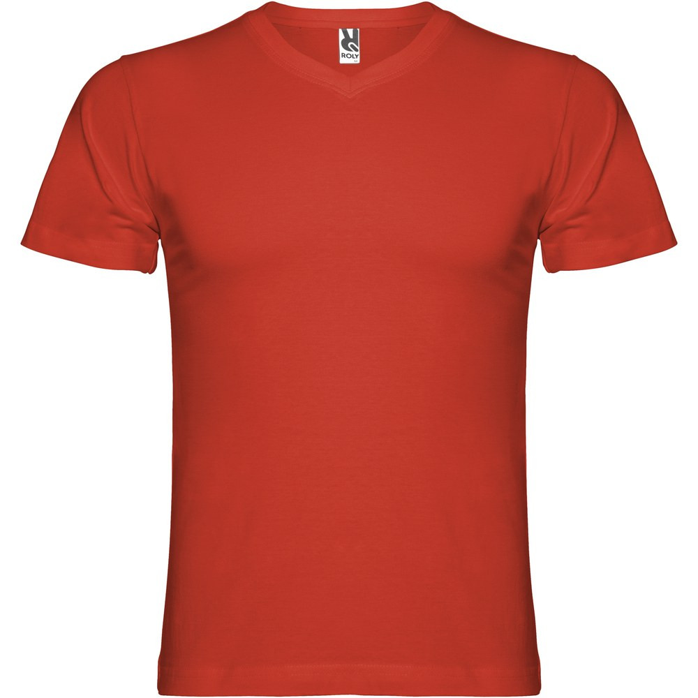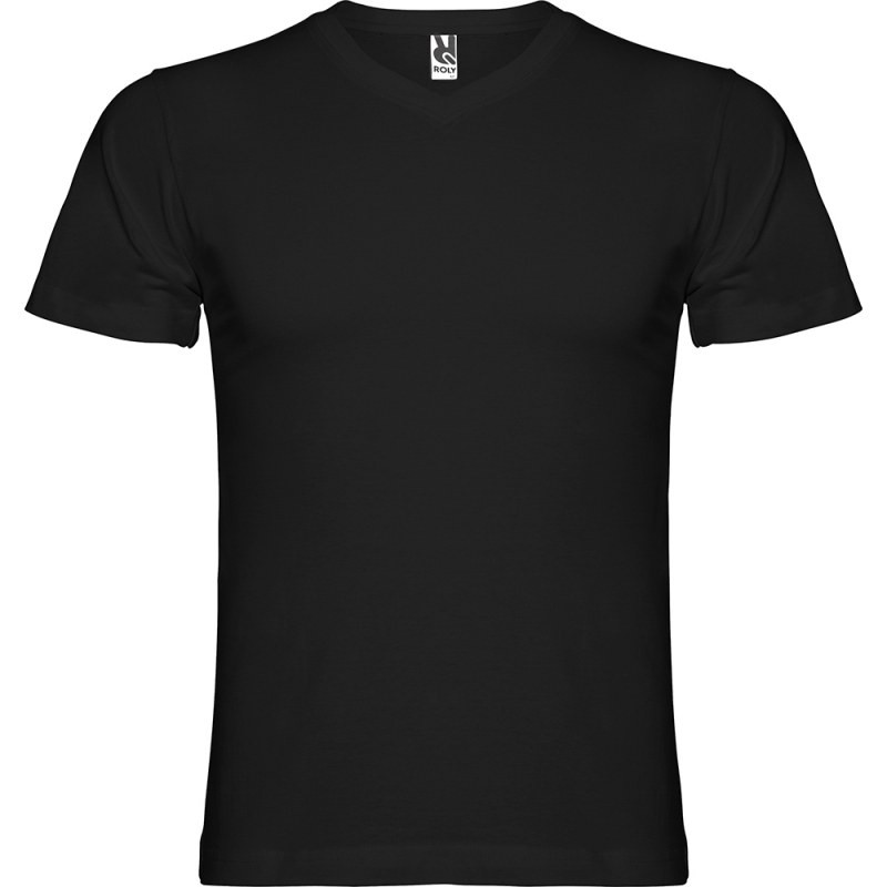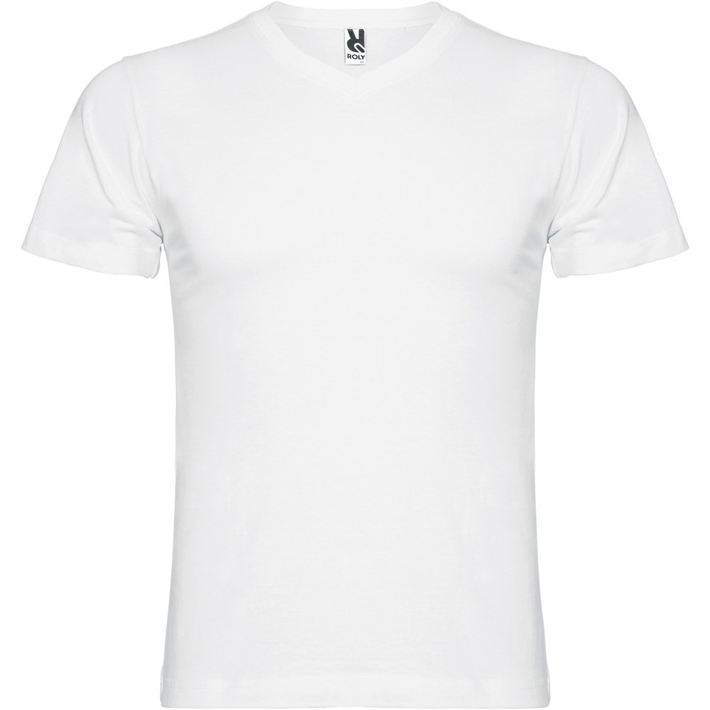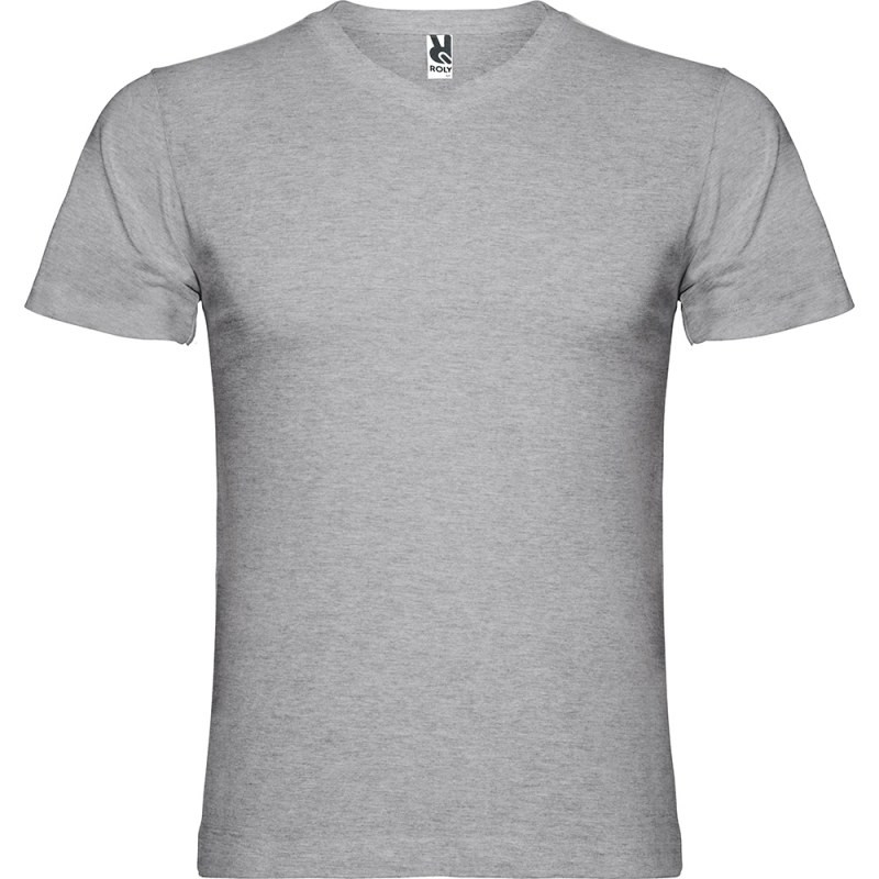 T-shirt tubulaire à manches courtes avec col en V 2 épaisseurs. Coutures recouvertes renforcées au col et aux épaules. Étiquette détachable. Le mannequin mesure 190 cm et porte la taille L.