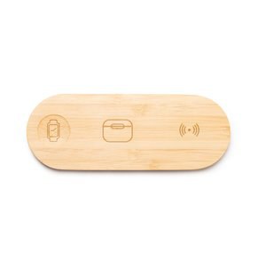 La station d'accueil de charge 3-en-1, fabriquée en bambou, offre une puissance de 15 W pour charger simultanément les smartphones, les smartwatches et les écouteurs sans fil.