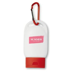 Ce tube de crème protectrice solaire de 30 ml est équipé d'un mousqueton très pratique pour le faire tenir sur un sac à dos par exemple.