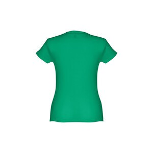 T-shirt ceinturé pour femme en maille jersey 100% coton (150 g/m²) avec fil de coton cardé (couleur 183 : 90% coton/10% viscose). Contient un col fin en jersey double avec un ruban de renfort en satin. Pièce coupée et cousue avec double couture sur les manches et le bas