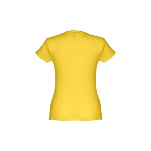 T-shirt ceinturé pour femme en maille jersey 100% coton (150 g/m²) avec fil de coton cardé (couleur 183 : 90% coton/10% viscose). Contient un col fin en jersey double avec un ruban de renfort en satin. Pièce coupée et cousue avec double couture sur les manches et le bas