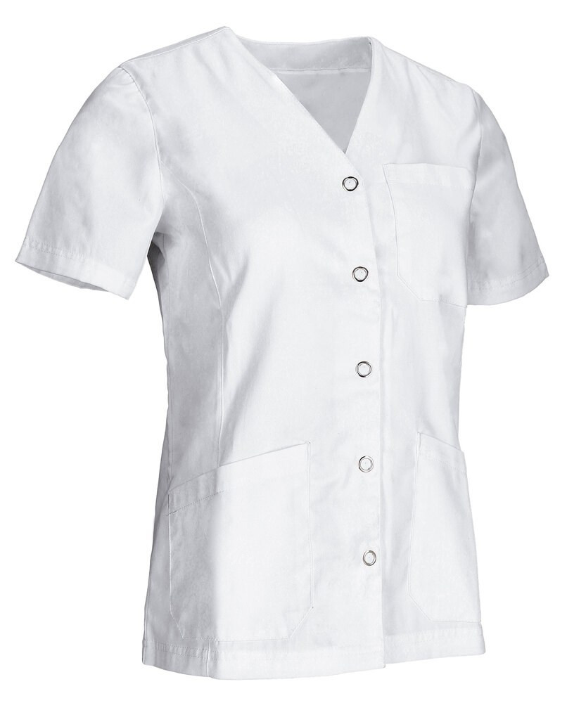 Blouse de travail manches courtes pour femme, coupe ajustée .Fabriquée en tissu sergé mélange coton avec polyester résistant et durable. Deux poches frontales et une côté cœur pour tout avoir à portée de main. Col haut en forme de V, ample, confortable, frais et élégant. Fermeture centrale par boutons à pression métalliques pour plus de confort. Convient pour diverses méthodes de marquage : sérigraphie, broderie, transfert, vinyle. Idéal comme vêtement de travail, vêtement médical et vêtement d’esthétique, etc.